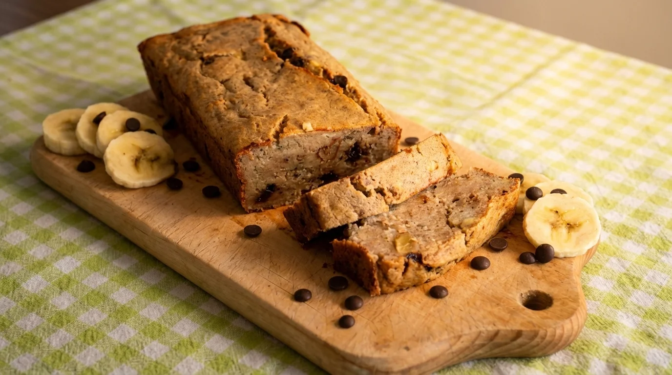 Saftiges Bananenbrot mit Proteinpulver, Haferflocken und optionalen Schokodrops – perfekt als Snack oder Frühstück.